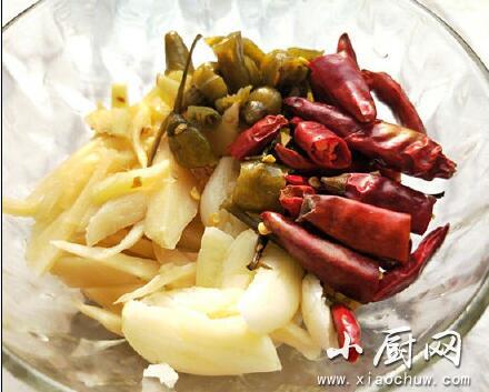 4.准备泡椒1把,干辣椒8个,生姜1块,大蒜1个,葱1根,洗干净切好备用。