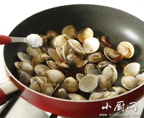 4、锅中炒出红油后,下入焯好水的花蛤,大火快速翻炒均匀。