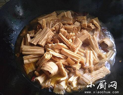 5.倒入腐竹,然后加入适量的老抽翻炒均匀,上色。