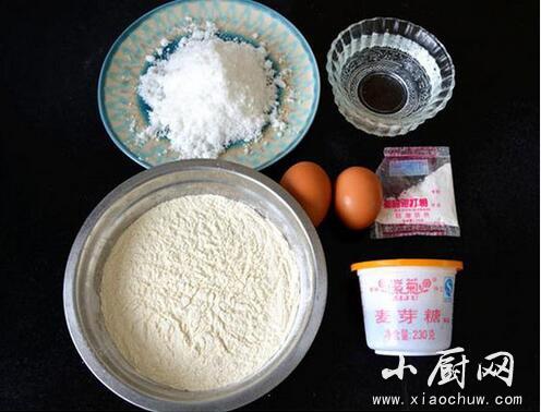 1.准备食材,面粉、鸡蛋、麦芽糖等。