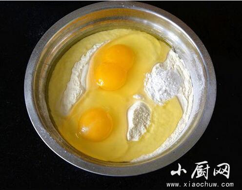 2.将鸡蛋和发酵粉放到面粉中,搅拌均匀。搅拌成光滑不沾手的面团。