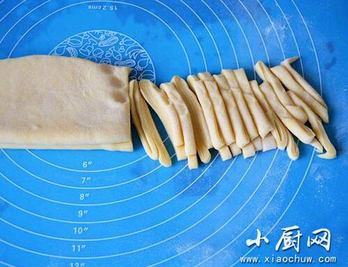 4.将发酵好的面团擀成薄厚均匀的大面皮,将面皮上下都撒上干面粉,防止粘起来,然后对齐叠起来,如上图。切成细长条,再切成4-5厘米的小段。