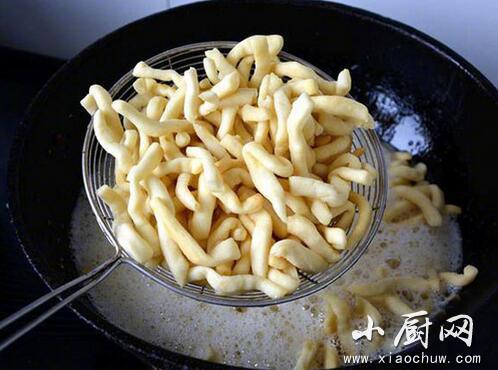 5.起锅热油,油温7成热时,下入面条进行炸制,待炸至面条发硬时,捞出,控油。油炸期间注意翻搅,受热均匀。