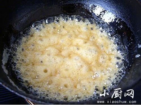 6.另起一锅,然后倒入清水和白砂糖一起小火熬煮,期间不断搅拌,待白糖水煮至起泡后,放入麦芽糖,继续熬煮至粘稠状态,用筷子蘸取一滴立刻放到冷水中,会出现拉丝状态,说明糖已经熬好了。