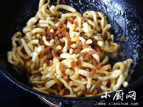 7.将事先炸好的面条放入糖锅里,再放入适量的葡萄干,搅拌均匀。