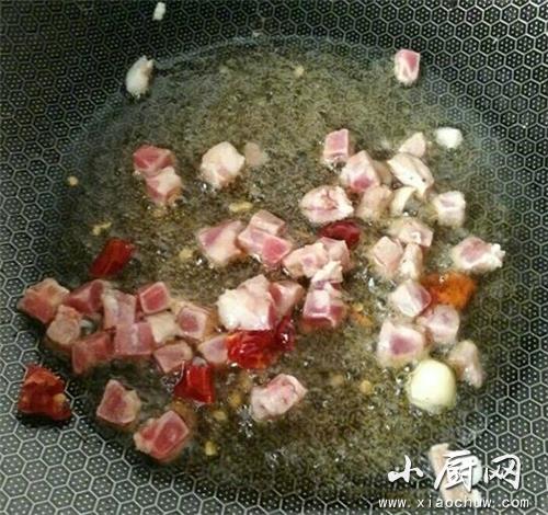4.把锅刷一下,然后再起锅热油,把肉丁和干辣椒下锅爆香。