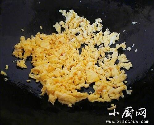 2.鸡蛋打散,放入少许料酒,盐,然后和鸡蛋液体积一半的水,搅拌均匀,然后起锅热油,将蛋液下锅,翻炒至金黄。